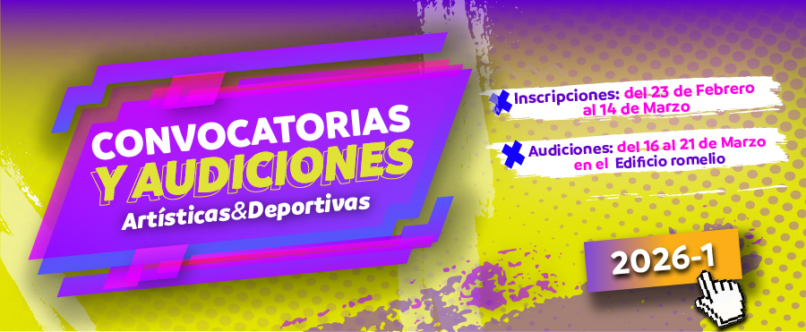 Desde Bienestar Institucional – Deporte y Cultura, abrimos oficialmente las Convocatorias y Audiciones Artísticas y Deportivas 2026-1, un espacio para que desarrolles tus habilidades, representes a la Institución y vivas al máximo tu experiencia Universitaria.